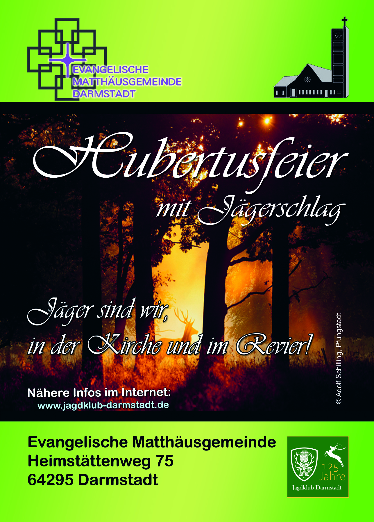 Wir feiern am 25.11.2023 um 16:00 Uhr unsere Hubertusfeier mit einem evangelischen Gottesdienst in der Evangelischen Matthäusgemeinde in Darmstadt.